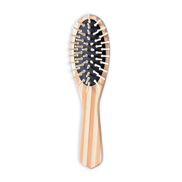 Spazzola in bamboo che è un materiale legnoso con proprietà antibatteriche, molto resistente e facilmente rinnovabile. L'impugnatura è larga abbastanza da permettere una presa comoda e salda dello strumento. Dentini hanno l'altezza corretta per permettere una facile pettinata: le ciocche vengono catturate in modo uniforme senza dover ripassare troppe volte sullo stesso punto; le palline che ricoprono i dentiti sono ancorate saldamente.