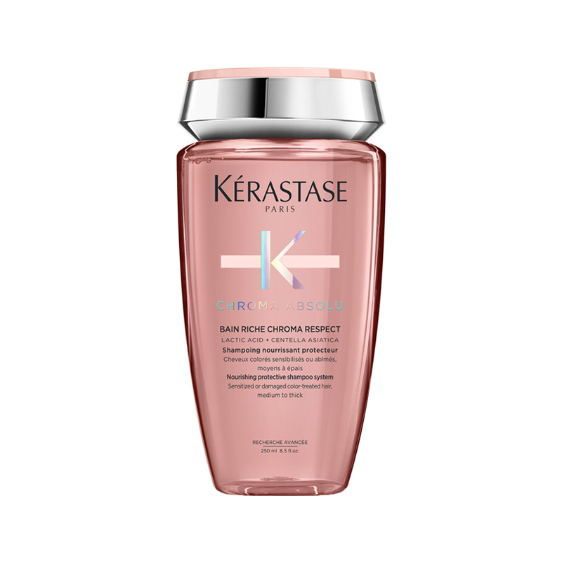 Kerastase Chroma Absolu Bain Riche Chroma Respect è uno shampoo nutriente multi-protettore della luminosità del colore per capelli colorati o con mèches sensibilizzati o danneggiati da trattamenti e soprattutto per le fibre dei capelli medi a spessi. Lo shampoo può essere usato quotidianamente, in quanto garantisce un'azione dolce e mai aggressiva, rimpolpa le zone danneggiate della fibra, prolunga e sublima perfettamente la brillantezza e il riflesso del colore. Non contiene solfati.